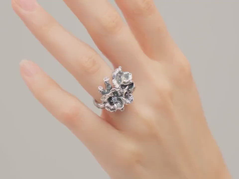 Silver Catchy Large Flowers Cocktail Ring with Multi Gemstones
