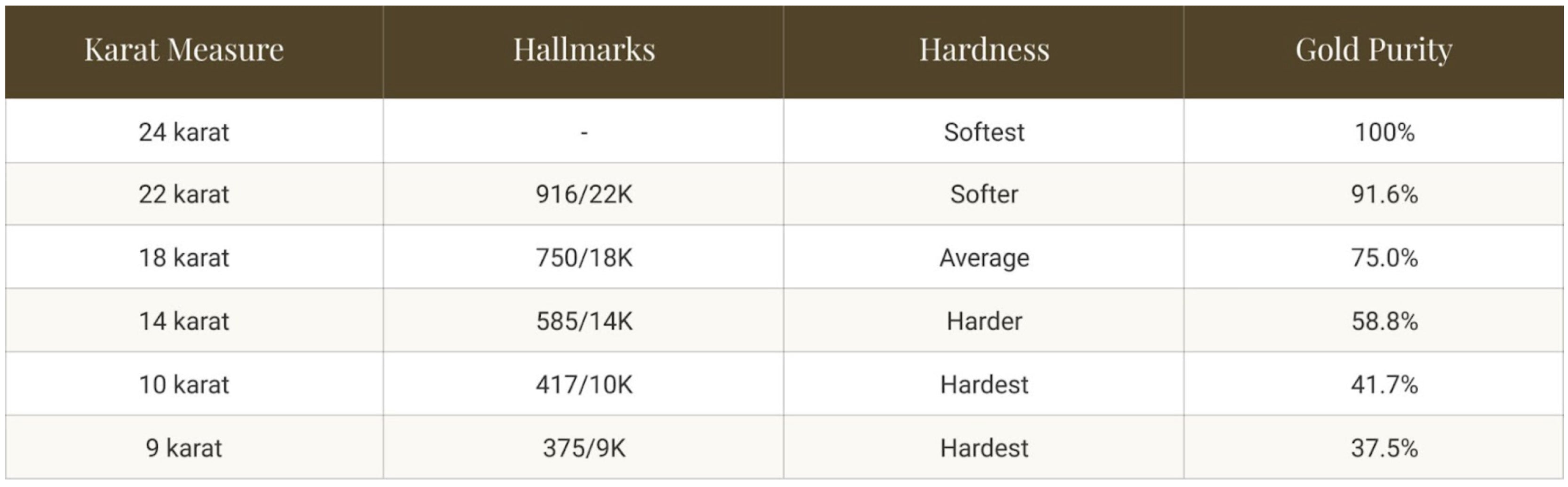 Jewelers use 18K, 14K, 10K and 9K gold to create their jewelry. If you want to know exactly how much gold they contain, see Table 1.
