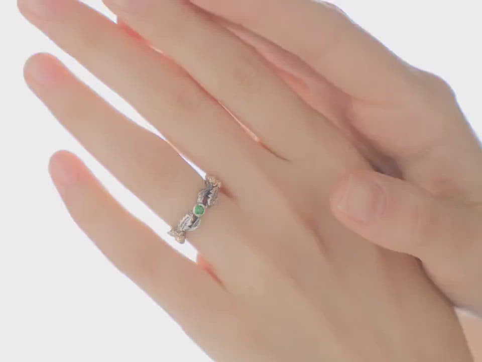 Acorns on a Branch Wedding Band with Emerald and Oak Leaves