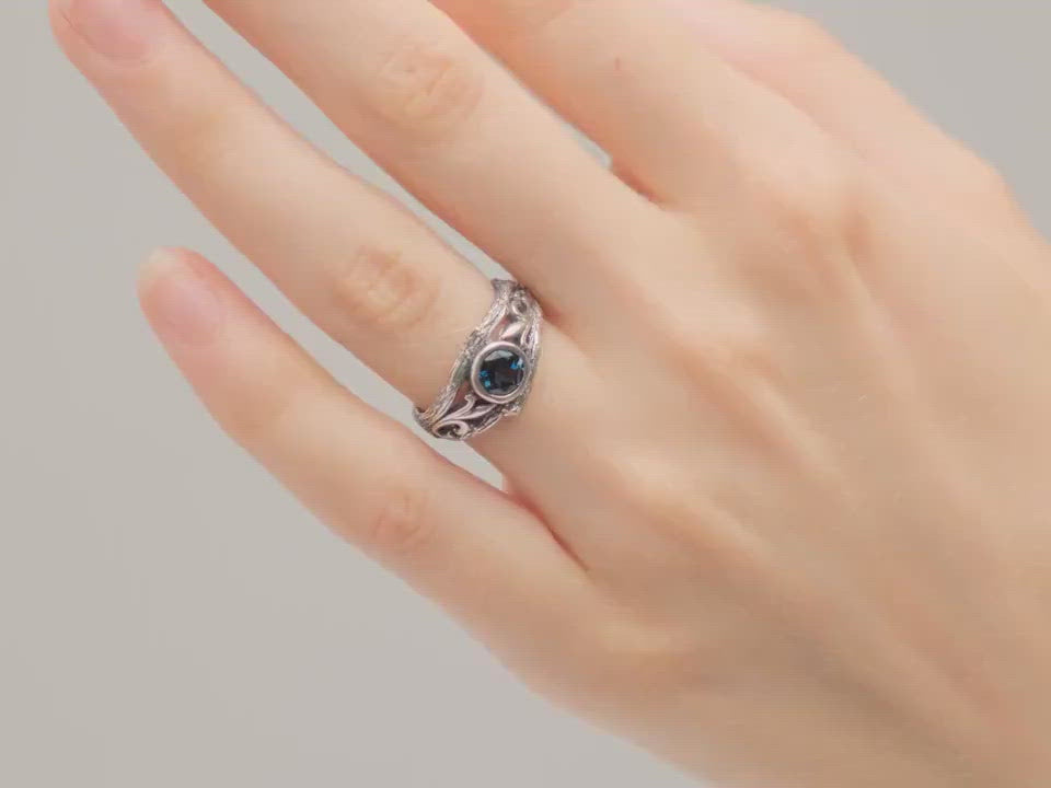This is a complex vintage silver ring with a character all its own. The blue London topaz is stuck between the branches. The pattern of the unusual tree bark combines with the vine motif and it gives the ring a majestic look. This is a ring for a unique woman.
