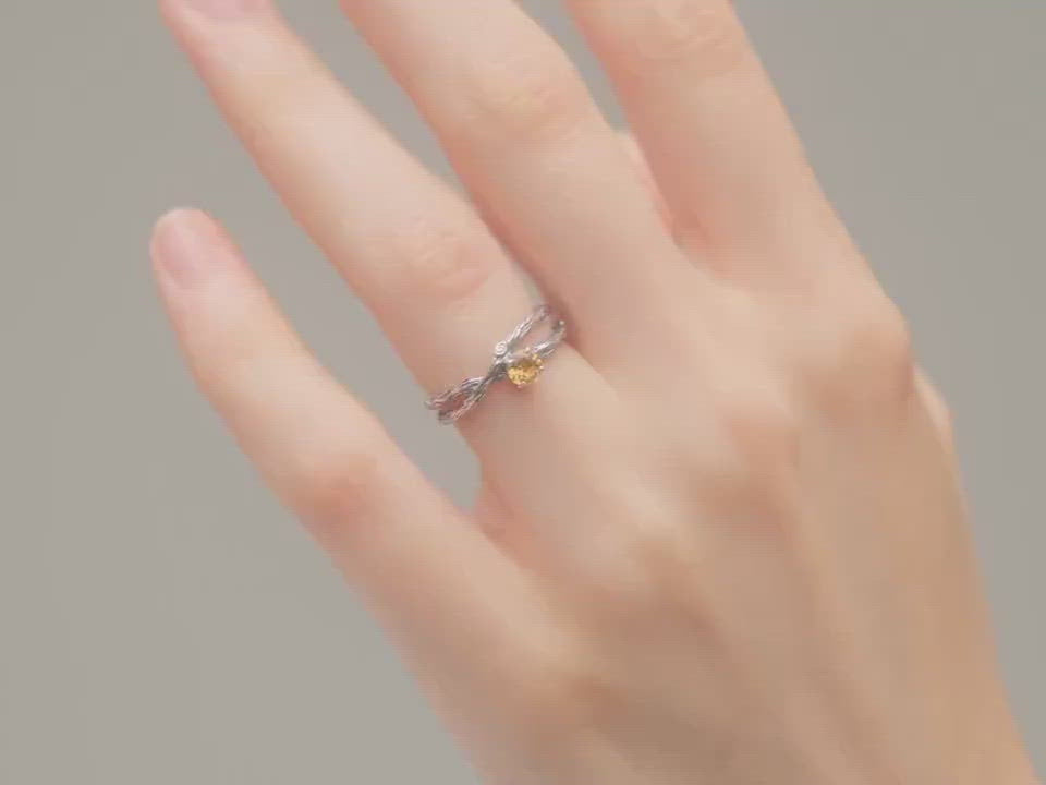 How fragile and delicate this silver engagement ring is. The young, dainty twigs are crossed and hold a piece of the sun - a yellow sparkling citrine. This ring is a gift for the romantic fairy.