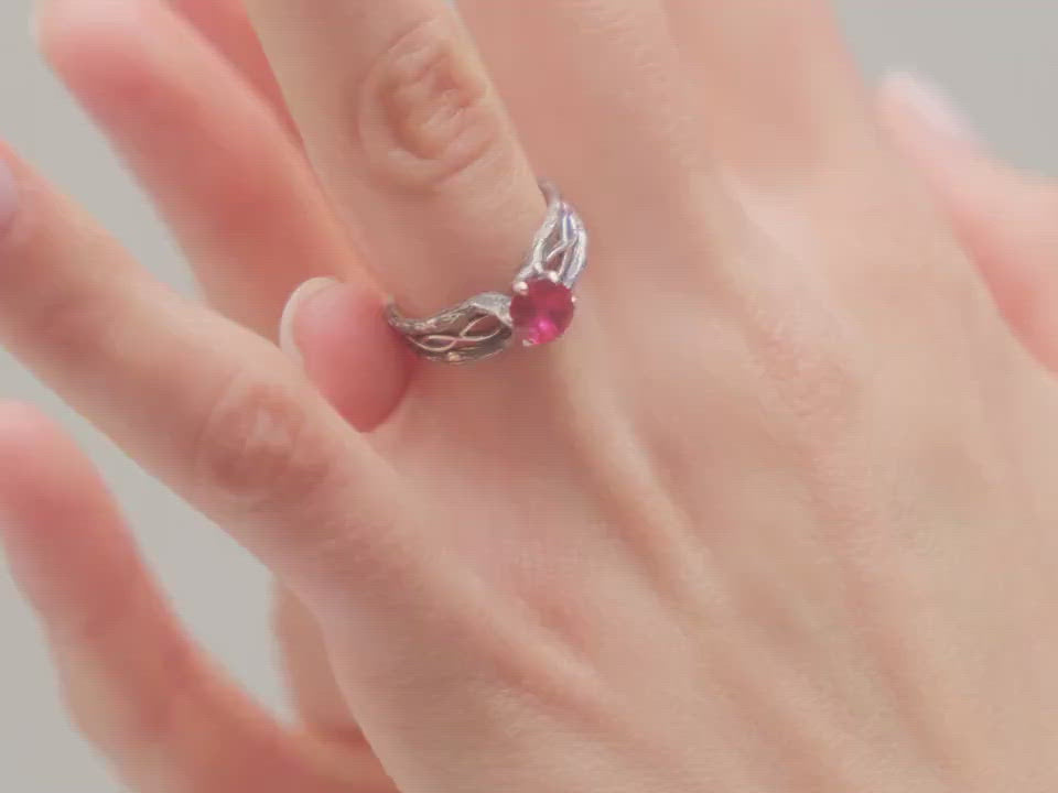 This gorgeous silver engagement ring showcases the astonishing branches arching up to hold the ruby. A beautiful symbol of love, growth and eternity, it is the perfect way to express your love for nature and your ever-growing love for your partner.