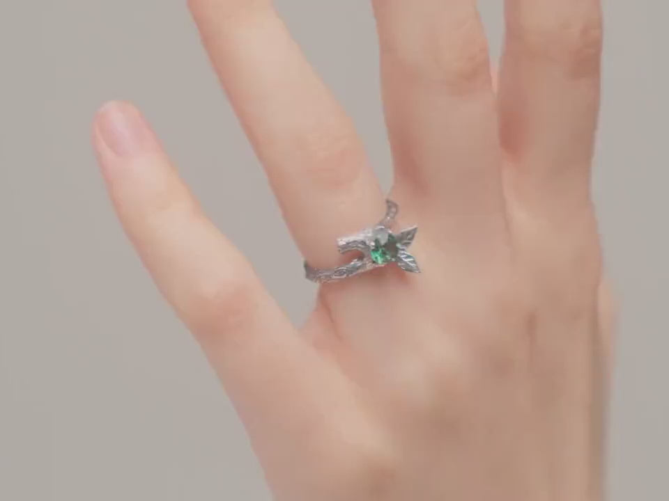 What a fine twig with leaves wrapped around the finger just like a real one - this exquisite miracle is a silver engagement ring with a stunning beauty of emerald. Our designer wanted to convey his admiration for Nature's sophisticated and delicate beauty.