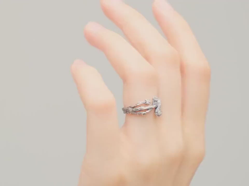 Thin, curly branches of silver are woven into an elegant and delicate engagement ring. Little gemstones sparkle on the branches, winking and catching every ray of sunlight to reflect it. This ring is the perfect gift for nature lovers.