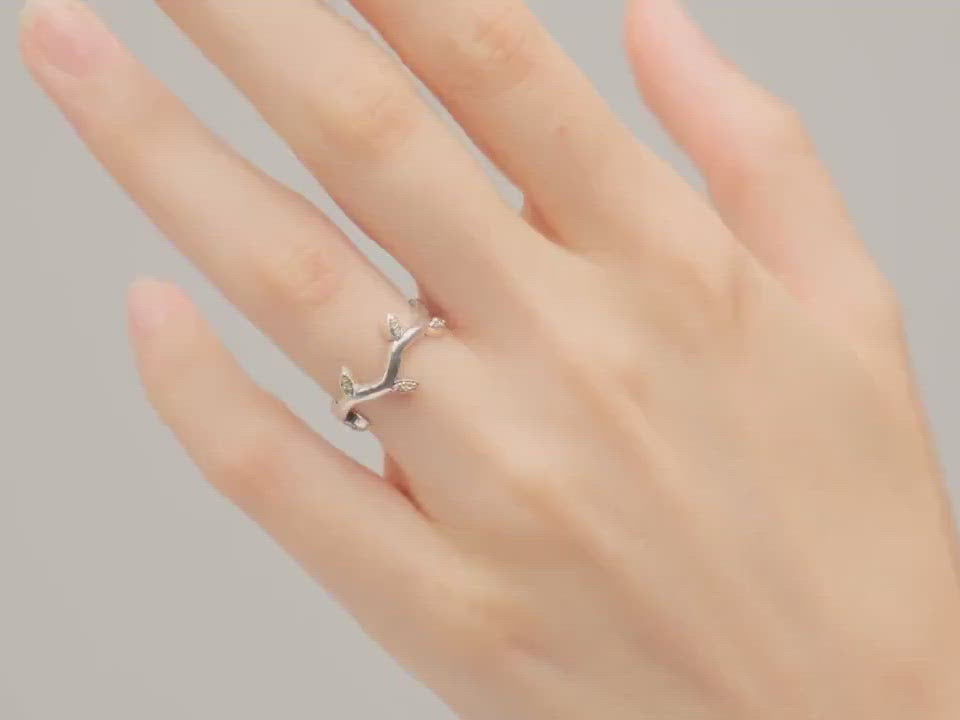 Thin Wave Twig Ring with Delicate Leaves of Natural Peridot