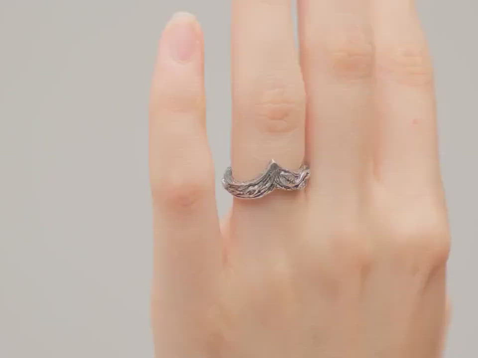 See how beautiful a rustic wedding ring with the texture of wood bark looks at a woman's delicate hand. The chevron-shaped branch with two leaves reflects the beautiful natural motifs. As if a gift from nature for her.